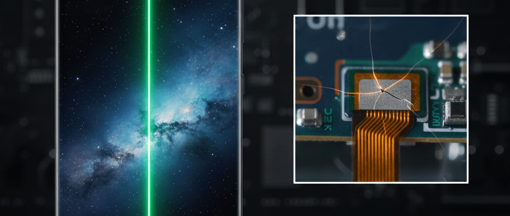 Garis hijau itu BUKAN virus. Itu adalah tanda putusnya jalur data pada panel layar. Layar OLED terdiri dari jutaan piksel yang dikontrol oleh Chip Driver. Sinyal dari Chip Driver dikirim ke Kaca Layar melalui sebuah kabel fleksibel tipis. Kabel fleksibel ini ditempelkan ke kaca menggunakan teknik Hot Bar Bonding dengan lem konduktif khusus bernama ACF (Anisotropic Conductive Film).