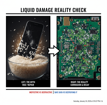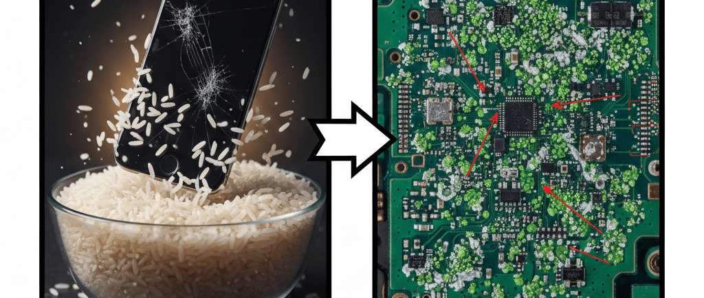 Apa yang terjadi di dalam beras? Air di dalam mesin akan menguap perlahan, meninggalkan residu mineral/gula yang menjadi Kerak Korosi (Karat Hijau). Karat ini akan memakan jalur tembaga mesin seperti kanker. Dibiarkan semalam di beras = Memberi waktu korosi untuk menyebar. Besoknya pas diambil, HP mungkin kering, tapi mesinnya sudah hancur berkarat.