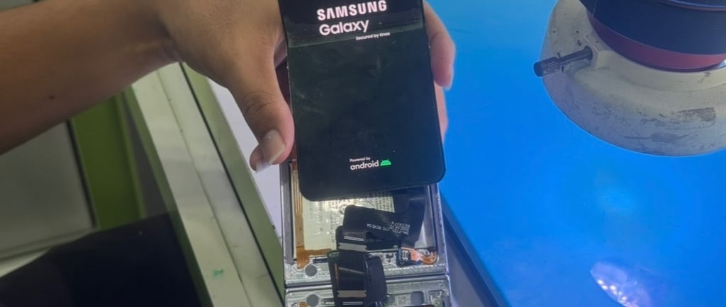 Langkah 1: Heating & The Dangerous Lift (Pengangkatan Layar UTG) Ini adalah fase di mana jantung teknisi berdetak paling kencang. Kami meletakkan Z Flip 4 Anda di atas Heating Pad presisi tinggi untuk melunakkan lem khusus yang menahan layar UTG ke rangka aluminium. Menggunakan cairan kimia pelepas lem khusus layar lipat dan lapisan plastik mika yang ketebalannya kurang dari 0.1 mm, teknisi ahli kami secara perlahan (milimeter demi milimeter) Memisahkan Layar UTG dari Rangka HP. Satu milimeter salah sudut tarikan, atau satu titik debu yang tertekan, Layar UTG akan pecah seketika, dan kami harus mengganti LCD Anda. Kami menanggung risiko ini dengan jam terbang dan keahlian tingkat dewa.
