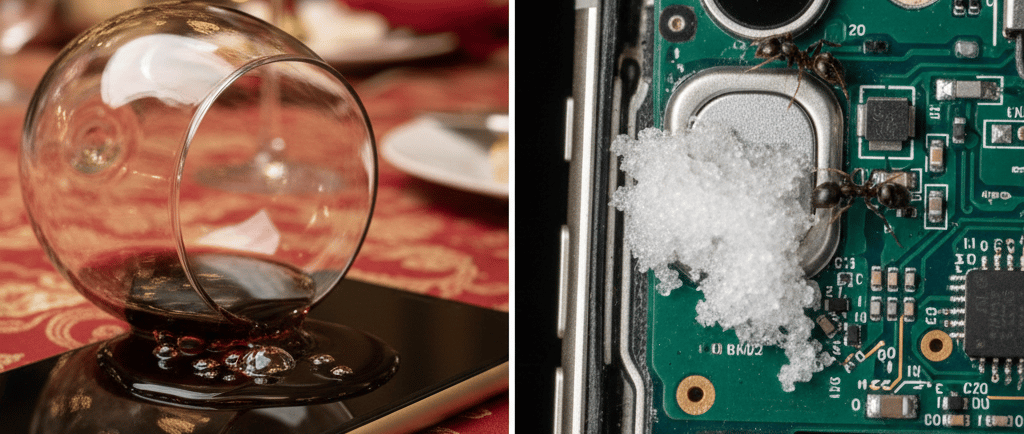 Undangan Pesta Semut (Biologis): Ini yang paling horor. Residu gula yang hangat di dalam mesin iPhone (akibat panas baterai) adalah SURGA BAGI SEMUT. Kami sering menemukan kasus iPhone mati total, dan saat dibuka, isinya penuh dengan koloni semut yang bersarang. Tubuh semut mengandung cairan yang jika tergencet di sirkuit listrik akan menyebabkan korsleting fatal (Short Circuit).
