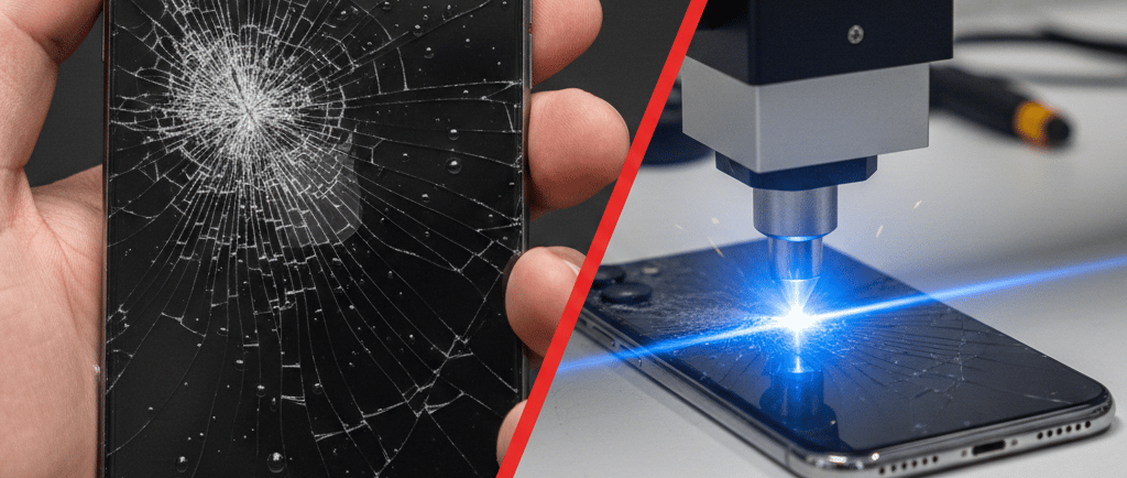 Membakar Lem: Sinar laser hanya membakar lapisan lem di bawah kaca sampai hangus, TANPA MEMPANASKAN komponen mesin di dalamnya.