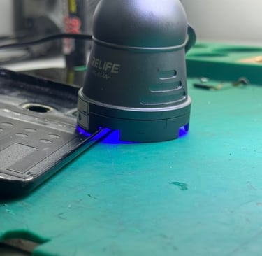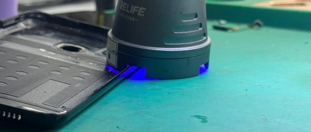 Teknisi mengoleskan cairan bening ke tepi layar atau backdoor HP, menyambungkan komponen, lalu meletakkan lampu berbentuk kubah yang memancarkan cahaya biru terang di atas area tersebut selama beberapa puluh detik. Proses selesai, komponen terekat sempurna.