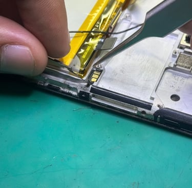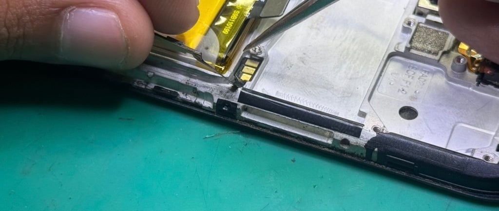 Untuk penggantian baterai — seperti yang terlihat di foto — baterai yang direkatkan adhesive ke frame harus dilepas menggunakan teknik yang tepat. Baterai modern HP Android hampir selalu menggunakan pull tab adhesive — strip perekat yang jika ditarik dari ujung yang benar akan melepaskan baterai secara bersih. Tapi pull tab yang sudah tua atau yang pernah mengalami panas berlebih sering kali putus sebelum adhesive sepenuhnya terlepas — dan di sinilah keahlian dan kesabaran teknisi diuji. Baterai yang dipaksa cabut tanpa pull tab yang berfungsi bisa tertusuk, yang pada baterai lithium adalah risiko keselamatan nyata.