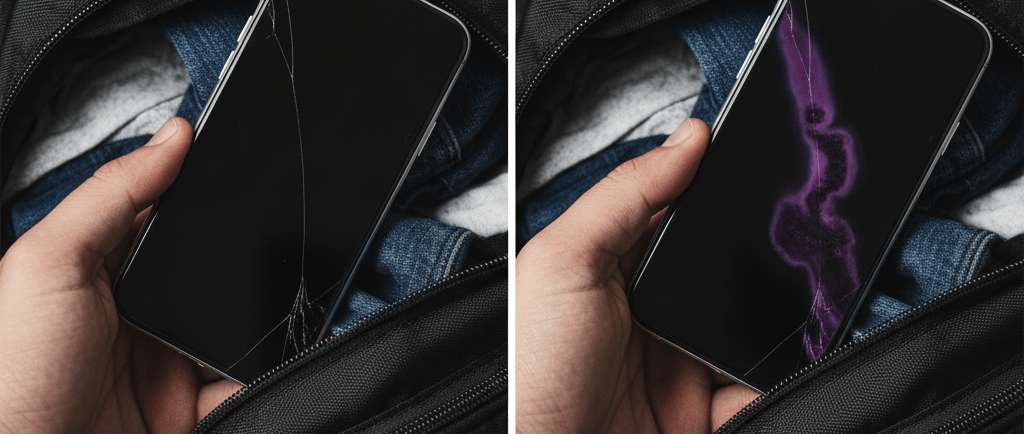 Akibatnya: Tekanan dari barang bawaan di tas akan menekan pecahan kaca itu langsung menusuk ke dalam, mengenai lapisan LCD/OLED yang lunak.