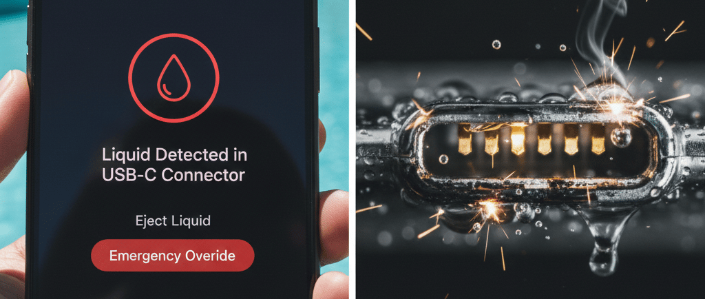 Peringatan itu muncul karena sensor di dalam port charger mendeteksi adanya konduktivitas (air/kelembapan) yang menghubungkan pin-pin emas di dalamnya.