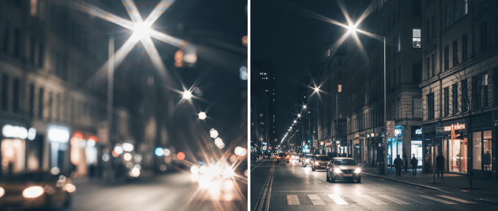 Flare: Cahaya lampu menjadi pecah berantakan, berkabut, dan tidak tajam.